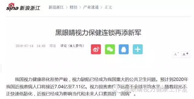我國視力健康惡化形勢嚴(yán)峻,視力缺陷已經(jīng)成為我國重大的公共衛(wèi)生問題。預(yù)計到2020年我國近視患病人口將接近7.04億至7.11億。視力損害患病率遠(yuǎn)高于全球平均水平;隨著屈光不正快速低齡化,近視已經(jīng)成為影響當(dāng)代和未來人口素質(zhì)的“國病”。