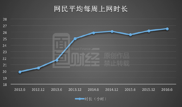 在網民人數增加的同時,上網時間也有所延長。2016年上半年中國網民的人均周上網時長為26.5小時,對比2012年上半年提高6.6小時。