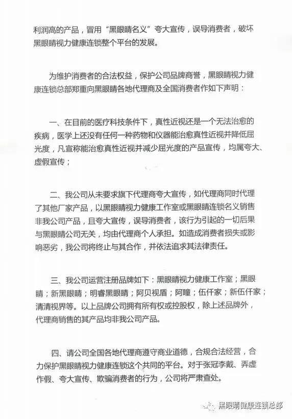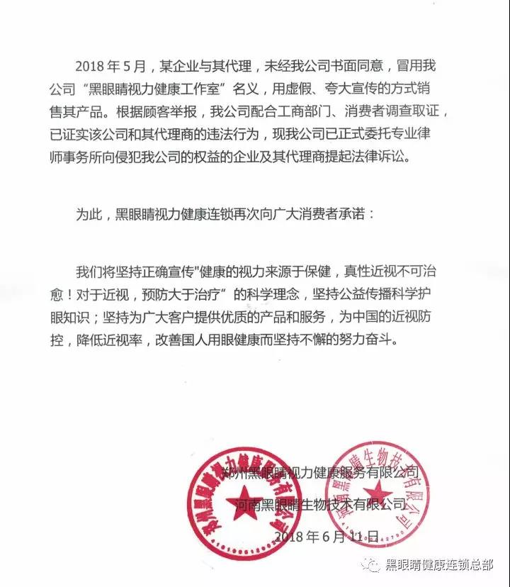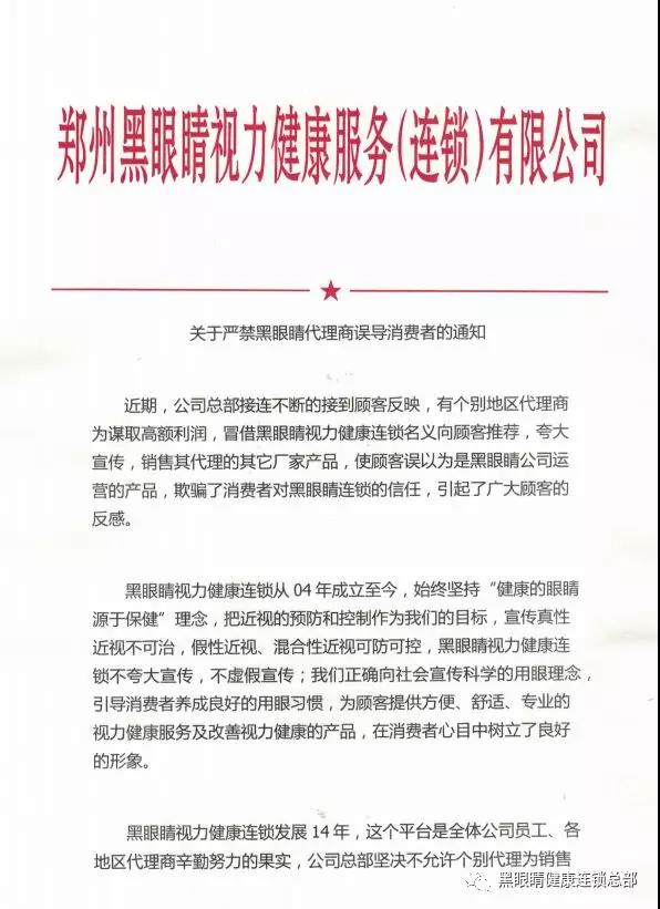 為維護消費者的合法權益,保護公司品牌商譽,黑眼睛視力健康連鎖總部鄭重向黑眼睛各地代理商及全國消費者作如下聲明: